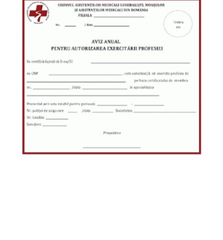 Avizul anual pentru exercitarea profesiei se eliberează în fiecare an, la cerere, de către filialele judeţene numai membrilor OAMGMAMR care fac dovada exercitării legale a profesiei, în domeniul titlului de calificare şi al studiilor absolvite, într-o unitate sanitară de profil autorizată, din sistemul sanitar public sau privat, în instituţii sau la alţi furnizori autorizaţi în vederea furnizării de servicii de îngrijiri medicale de sănătate, conform prevederilor legale.